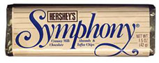 ![]() Hershey's Symphony with Toffee and Almonds Look, I know Hersheys is the Starbucks/Disney/Microsoft/Sony/Rod Stewart of the candy world, but face facts: Starbucks has the Caramel Macchiato, Disney has Lady and the Tramp, Microsoft has the Trebuchet font, Sony has DVD players out the wazoo, and Rod Stewart has "Young Turks." Similarly, Hershey's has Symphony, one of its high-end "sophisticated" candy bars aimed at the older crowd. It is fucking good. Rich creamy milk chocolate with delicious sweet toffee chips and crunchy almonds for substance. Taken together, it is truly a symphony of succulence for the La Scala of your mouth. It sings an aria on your tongue, and creates a movement in your bowels. Er, maybe that's where I should stop with the half-assed classical music metaphors.