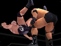 The gameplay in Mayhem is decidedly different than that of Attitude, this much is apparent right away. First off, the wrestlers move much, much faster in Mayhem, at least twice as fast. Even "Big Lazy" Kevin Nash skitters around the ring like a luchadore hopped up on crystal meth. The system of executing moves is also notably different. Whereas Attitude relies on specific button combinations that differ from wrestler to wrestler to execute moves, Mayhem uses the same system with each wrestler; only the moves executed change. Each wrestler has a number of moves he can execute from the "grapple" position, which is when the wrestlers lock up. When a grapple is done, the player will hit either a single button, or push the D-pad up or down and hit a button. This system is very simple and easy to learn, but it seems very limiting. Where Attitude had seemingly countless moves that a wrestler could do, Mayhem seems to max out with maybe twenty moves per character. Part of this results from the fact that Attitude allowed moves to executed from the "ready" position (wrestlers are near each other but not grappling) and in fact, it heavily favors these moves. Mayhem doesn't allow this; all you can do from the ready position is basically punch or kick your opponent in various ways (an elbow or a drop kick, for example). They could have made up for this by adding moves to the grapple, simply by adding different moves when the player pushes left or right and a button, but this isn't the case. As is, a Mayhem wrestler has a maximum of nine moves possible from the grapple (not counting the Irish whip, which is done by holding the R1 button and hitting X) which is inexcusably low compared to Attitude. The moves executable in other situations seem to be sparse as well, Generally, a wrestler has one move that can be executed off the top turnbuckle, and one that can be done after whipping an opponent into the ropes.