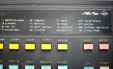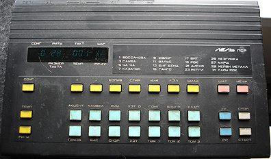 The LEL is a purely digital beast, and with most gear that ends up in my hands, is full of head-scratching quirks. Four of the pads don't seem to work, though admittedly one is probably an 'accent'. And beyond that, the contacts could probably use a good cleaning, 'cause they don't always trigger (see demo at bottom of page as an example). There are a few presets onboard - possibly user programmed - that have a bunch of sounds playing simulateous, of which the tempo slows down greatly because the microprocessor can't think that fast. Also, in the demo, you'll hear a continual, digital wavering noise, also courtesy from the LEL. Delightful. Oh, and no volume control to speak of, though I'm sure that's my Cyrillic-ignorance at fault.