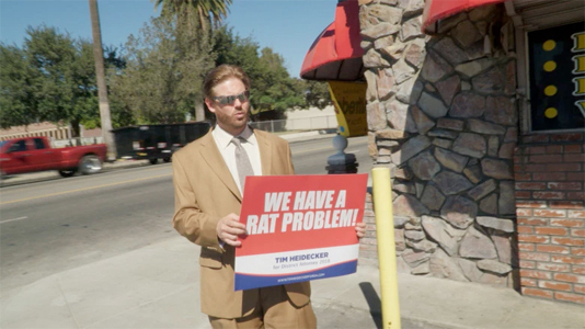 In terms of conceptual comedy, Tim Heidecker's pedigree is unquestionable. Whether that means you will enjoy everything he chooses to create is another story. Mister America is a prime example of his commitment to taking a joke as far as possible, and letting the laughs—if any—simply fall where they may. The film is an extension of On Cinema At The Cinema, Heidecker's series with Gregg Turkington. If anyone matches or exceeds Heidecker's own relish for complete banality, it's Turkington, whose Neil Hamburger character is as polarizing as, say, Heidecker's earlier film The Comedy. Together they create a reality so relentlessly uninteresting, and a dynamic so petty, that watching Mister America without having seen the earlier series, you might well just think this is a very flat documentary. The genius of it, though, is how the film builds on events from the web series to take the story into a much wider and bleaker reality. Heidecker and Turkington play fictional versions of themselves whose relationship deteriorates over the course of Heidecker's spiteful and deluded campaign for District Attorney of San Bernadino. Whether or not you've seen the lead-up, Mister America is not aiming for big belly-laughs. If anything, the most savage humor comes in the form of micro-jokes like Heidecker blithely drinking a Bud Light, or saying a bunch of words devoid of any content to show how not present this character is in any given moment. It's comedy, alright, but a particularly brutal form which has only the slightest of empathy for its characters. The performances are great, especially Terri Parks as Heidecker's long-suffering friend Toni Newman, whose increasingly disillusioned reactions to Heidecker's complete lack of self-awareness are kind of heartbreaking. Heidecker, as usual, proves eerily adept at playing an empty vessel, clearly drawing from the MAGA well to embody the sort of vacous entitlement we see so much of these days. And while the film ultimately feels pretty slight, it does seem like where On Cinema needed to go, purely by following its intentionally beige logic to its natural conclusion.