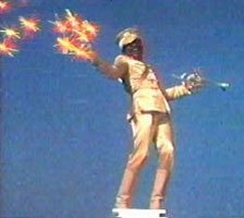 The tone shifts wildly between genuine slapstick and absurd pathos, culminating in a scene wherein meek Peter Frampton struggles to overpower an obviously wasted Steven Tyler of Aerosmith, but is unable to, so his girlfriend Strawberry Fields (Sandy Farina) manages (though chained to a giant electrified dollar sign) to send Tyler plummeting to his death killing herself in the process. Here, the film goes off into a truly weird funereal passage that ends with Peter Frampton throwing himself from a window in desperation. At that moment, the film cements its stature as a real gonzo classic, when a magical weathervane suddenly begins spinning wildly and abruptly transforms into Billy Preston, in gold lamé "Sgt. Pepper" suit, and he flies around the town square, belting out "Get Back" and literally turning back time with his laser-beam-firing fingers. Preston brings Strawberry Fields back to life, halts Frampton's suicide attempt, and materializes a huge chorus of mostly C-list celebrities to sing the film's closing number, a second reprise of the "Sgt. Pepper" reprise. This bizarre assemblage (which includes Carol Channing and Leif Garrett, among many others) is fascinating in a "Night of 1,000 Stars" sort of way.