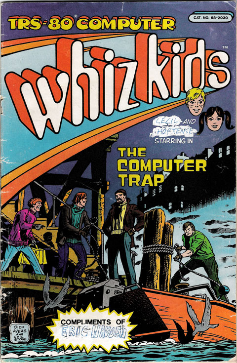 In this, the first installment of our series casting a harsh eye on the follies of our youth, we look at an early creation by Loud Bassoon writer Eric Haugen, revealing that no matter what creative heights you might achieve, you left behind a shamefully lame youngster cracking stupid-ass jokes straight out of Mad magazine. By bringing these creations to light, we find humility, and forgiveness for our dorkier, pudgier earlier versions of self. And/or, we get a kick out of teasing the pudgy dorks for being such dorks. Let's get started! In junior high, Young Eric came into possession of a lame Radio Shack-produced comic book called TRS-80® Computer Whiz Kids, and got the bright idea to white-out all the exposition and dialogue, replacing it with "hilarious" spoofin'. Though this may have garnered Eric some praise from his school-chums back in the day, the results don't exactly match his current comedic sensibility. The cover sets the tone, with the Whiz Kids renamed "Cecil" and "Hortense," and the author's name all-too-proudly plastered over Radio Shack's.