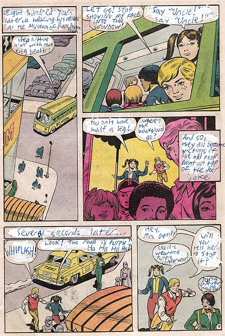 Eight hundred years later, a talking bus arrives at the Museum of Rare Banana Peels. Bus: Stop hitting him with that egg beater! Cecil: LET GO! STOP SHIVING MY FACE INTO THE WINDOW! Hortense: Say "Uncle!" Say "Uncle!" Hortense: You only have half a leg! Cecil: Where'd the background go? And so, they all become victims of the old pink paint on top of the door joke. Several seconds later