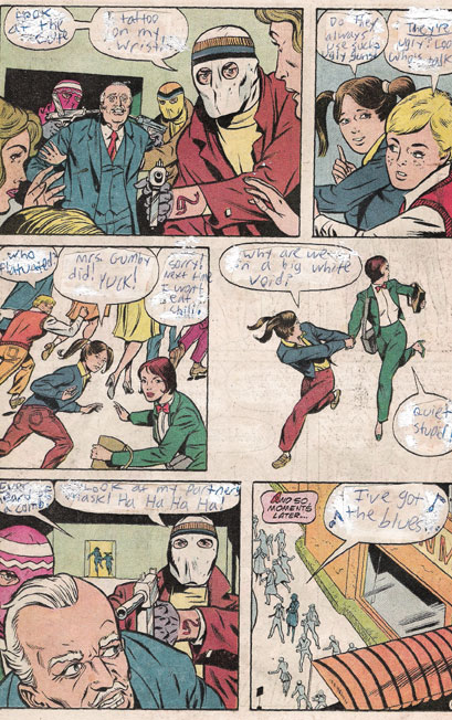 Man #1: Look at the cute tattoo on my wrist! Hortense: Do they always use such ugly guns? Cecil: They're ugly? Look who's talking! Cecil: Who flatuated? Hortense: Mrs. Gumby did! YUCK! Mrs. Gumby: Sorry! Next time I won't eat chili. Hortense: Why are we in a big white void? Mrs. Gumby: Quiet, stupid! Man #1: Ever heard of a comb? Look at my partner's mask! Ha Ha Ha Ha! And so, moments later