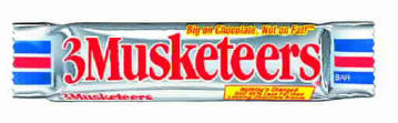 ![]() 3 Musketeers "All for one and one for all!" Actually, I've never really liked the Three Musketeers as a concept, but as a candy, it's pretty damn SWEEEEEEEEEEET. Creamy nougat covered in delicious milk chocolate. It's one of M&M Mars' simplest and finest creations. It's also lower in fat than most regular candy bars, which means you can eat three more for every regular bar you would normally have. That translates to one thousand 3 Musketeers bars every week for me, now that I'm on my bulk-up diet in an attempt to become the world's first 2,000 pound supermodel. The World Weekly News promises me $5000 if I can do it, and they already gave me a $50 advance. If I can avoid congestive heart failure, I'm SET.
