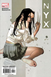 NYX seemed to have disappeared after issue #3, gone from the shelves for several months, which usually signifies no good thing for a comic's future. That would be my luck, as the comics I get into inevitably get canceled after like six issues. All for the best, of course, as I would hate to start, like, buying storage boxes to hold hundreds of comics. The last thing I need is one more thing in common with Kevin Smith. This issue fills in some details in the story of Kiden, a mutant raver girl who can stop time, and her mysterious encounter with X-23, a softspoken mutant teen whore with Wolverine-like claws. Though it repeats much of what's already happened, the approach is fleshier and more engaging; plus, after so many months away, I don't mind having my mind refreshed. Turns out, Kiden is being guided by her dead father, whom she sees as a ghostly presence, albeit a bloody ghostly presence. Must be hard to have your dad telling you what to do while covered in blood. Certainly it was for me after Dad killed Mom. "Get a mop, faggot," he said. The issue also introduces a mutant Latina teen who can, I think, control animals. I haven't seen this many mutant teen girls since my camp-counseling days at Lambs Farm. The art is stellar, and the storytelling gets better and better. Hopefully NYX #5 will not be so long coming