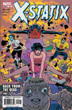 for good. Around this time, the team deaths start coming fast and furious, including a couple real shockers, even for this title. The final issue of the storyline parodies The Ring with tongue completely in cheek, and with even more shocking deaths. The plotlines, of course, don't recommend X-Statix as much as its sense of humor, which frequently makes me laugh, its extremely hip artwork, and its continual reinvention. Where it will go from here, I have no clue, and that's exactly the way it should be. That's why I plunk down $2.99 a month for funnybooks, man