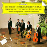 ![]() Franz Schubert Here's your second choice for a great recording of Schubert's Quintet in C, which is one of his two or three greatest chamber works, and one of the great masterpieces of chamber music. Now, don't get all hot under the collar, I'm no expert on classical music, but I knows what I likes. I likes the chamber music, on account of it's so purty, and I especially likes the Schubert on account of his melodies are so striking. Sometimes I describe him as "the Paul McCartney of classical music," but that's confusing, because Schubert never even in his limper moments could have conceived of "Loup (1st Indian on the Moon)," and furthermore Sir Paul's own forays into classical music are strikingly unmelodic compared to his pop songs. Schubert in song as well as chamber and orchestral music was above all a melodist, and that's why his music remains so accessible to me. I approach him as I do a pop songwriter perhaps a better description would be "the Paul Williams of classical music" ? But then, Schubert was never on "The Muppet Show," so scratch that. Schubert's primary gift was songwriting (he wrote "Ave Maria," which is probably the best song ever written, if you ask me; I mean, besides "Pass the Dutchie"), and his relentless tunefulness pervades his larger works as well. What I like about the chamber music is that it is somewhere between the intimacy of his songs and the seriousness of his symphonies the quartets and quintets (and octet) are relaxing but not background music. They give you much pleasure and reward greater attention paid, and details emerge with repeated listens. The Trout Quintet is the ultimate piece of chamber music in my opinion (best recording being on Sony with Emanuel Ax and friends), but the Quintet in C is right up there a bit more dramatic, less playful, and very much as melodic. Almost every moment is stirring and each passage develops dynamically and with a wealth of ear candy for the middlebrows like myself whose ADD gets in the way of appreciating anything that requires too much brain power. The C-major Quintet is given the instrumentation of a standard string quartet (two violins, viola, and cello), with the addition of a second cello, giving the sound a weight and substance that is uncommonly striking. This performance is very good, though not quite as spectacular as the Alban Berg Quartet version with Heinrich Schiff. The Emerson String Quartet recorded this in 1992 with übercellist Rostropovich, and it's a fantastic, full-blooded performance, though to my ears, a touch cold in parts, a bit overly studied. Sometimes the very best names are too overwhelming for certain pieces, and I'd say that the Emerson's Schubert lacks a certain delicacy. However, it's a virtually flawless recording I suppose I just like the Alban Berg Quartet version so much that this one suffers from my personal bias. Certainly you couldn't do much better if the other is not handy, this one is absolutely recommendable. If you really want the best, go with the other (it's in the EMI Great Recordings of the Century line), but this DG release is excellent, and many critics prefer it strongly to all others. Hm, so much hemming and hawing okay, I'll just admit it, I still don't trust the Russians. Didn't you see The Day After?!?!?!